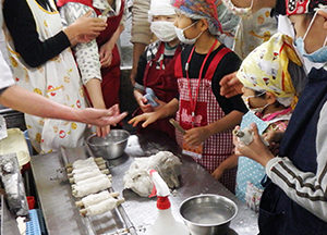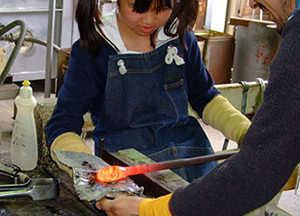 お店に並んでいるグラスとはまた違う、自分で作る愛嬌のあるグラス。溶けたガラスを吹き竿に巻き取り、息を吹き込みながら形…