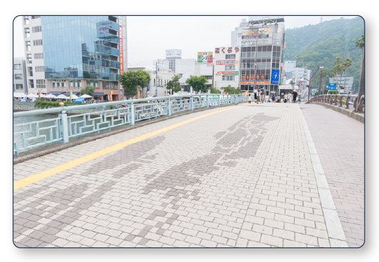 橋を渡りながら、ふと地面に目を落とすと、地面のブロックで踊り子の姿が描かれています。橋を渡ったら阿波おどり会館はもうすぐそこ。