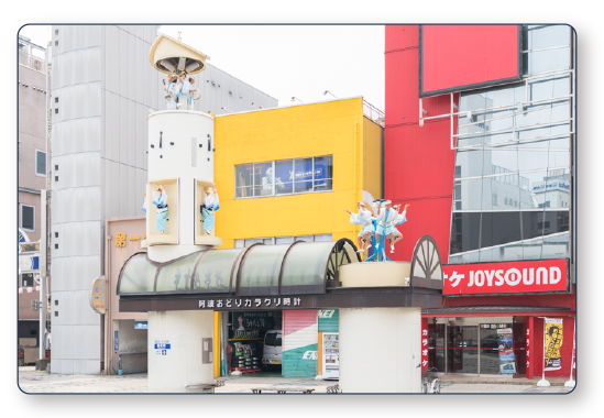 時間になると、阿波おどりのお囃子にのって、カラクリ時計のあらゆるところから踊り子の人形が飛び出してきます。夜にはさらにLEDの演出が加わって、見応えも倍増!