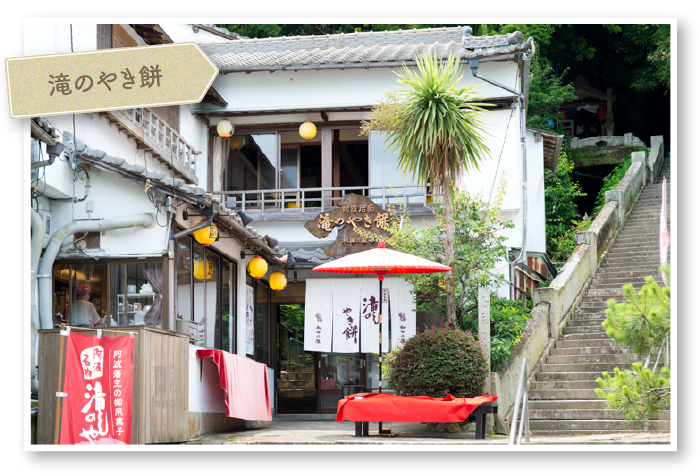 阿波おどり会館の北側一帯に広がる「寺町」と呼ばれる古都の味わいが感じられるエリアからすぐ近く、眉山の麓の大滝山登口付近には『滝のやき餅』と書かれた旗が立ち並ぶ場所が。