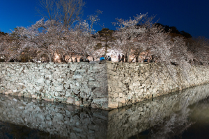 市中心部に位置する徳島中央公園は、市内随一のお花見スポットとして親しまれています。徳島城跡を利用した園内には250本を超えるソメイヨシノなどが植えられており、開花時期には桜や堀川沿いの石垣が午後10時頃までライトアップされます。水面に映る夜桜は一段と幻想的で、お花見客を魅了しています。堀川脇に建つ「鷲の門」は1945年の徳島大空襲で焼失後、市政100周年を記念して1989年に復元されたものです。園内には国の名勝に指定されている旧徳島城表御殿庭園や徳島城博物館などの見所もありますので、桜と併せてお楽しみください。