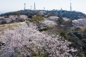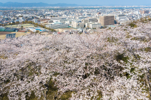 眉山の山頂にひろがる公園周辺は野鳥の種類も多く、街の喧噪を離れてお花見を楽しめます。眉山ロープウエイの山頂駅から約300本のソメイヨシノが植えられている園内のお花見スポットへは、徒歩5分ほどの距離。ライトアップは実施されていませんが、眉山から眺める市内の展望もお薦めです。