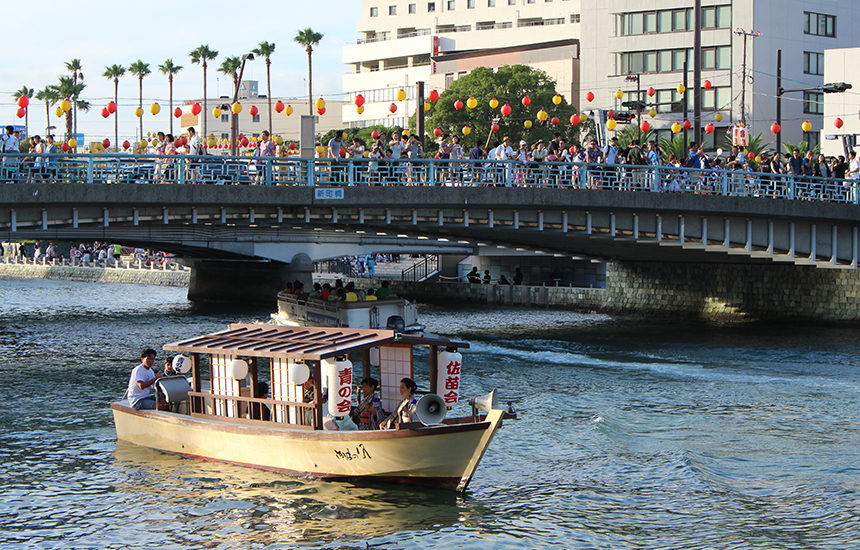 屋形船と邦楽の夕べは、水都徳島のシンボル『新町川』で行われる夏の風物詩。船上で三味線や笛に合わせて民謡や長唄を奏でながら、屋形船が川をゆっくりと進んでいく。新町川・阿波製紙水際公園などの水辺で邦楽の調べを味わうことができ、夏の夕べを情緒豊かに彩るイベントである。