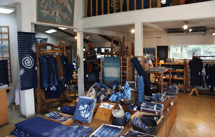 阿波正藍・しじら織に加え、力織機で織るデニム生地、阿波紬などを生産・販売している『岡本織布工場』のショップが『藍布屋』です。店内には木製の手織り機もあり、希望があれば手織り機を使用して織物を織り上げいたします。藍色の幅広いアイテムが並び、藍染体験は3日前までに予約が必要です。ストール、スカーフ、テーブルクロス、Tシャツなどを染めることができます。