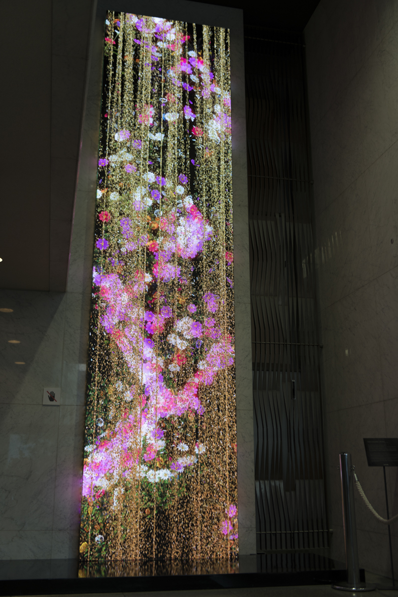阿波銀行の旧本店内にあるLEDデジタルアート。高さ5210mm、横幅1280mm、奥行き160mmのLEDでできた巨大なサンドフォールで、そこに咲く花々は月ごとに変化していきます。流れ落ちる黄金の砂の前に立てば、鑑賞者の動きの影響を受けて砂が割れていき、その流れは変容し続けます。そのようにサンドフォールはリアルタイムで描かれるため、今この瞬間の絵は二度と現れません。