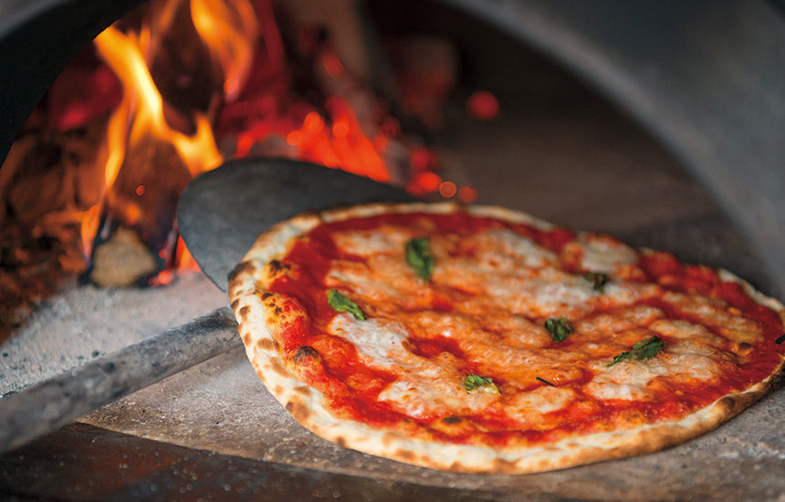 とくに、地元の旬の食材を取り入れ、巨大な窯で薪焼きしたピッツァが人気。