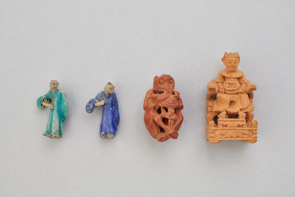 青と緑の陶器製玩具(15×5mm)、果物の種と木片に精巧な彫刻を施した根付二種(20×15mm)です。