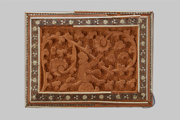 可憐な花が咲く木の枝と、そこに遊ぶサルを両面に木彫。周りは象牙や貝で細やかに装飾(64×90mm)されています。
