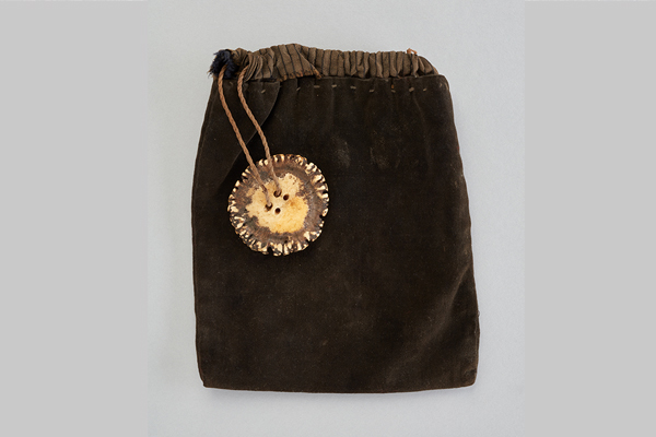 刻み煙草入れとして愛用した黒ビロード製の巾着袋。鹿角を輪切りにした留め具は、使用感のある色合いです。(徳島県立図書館寄託)