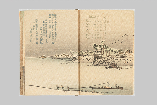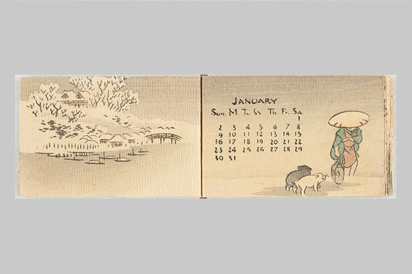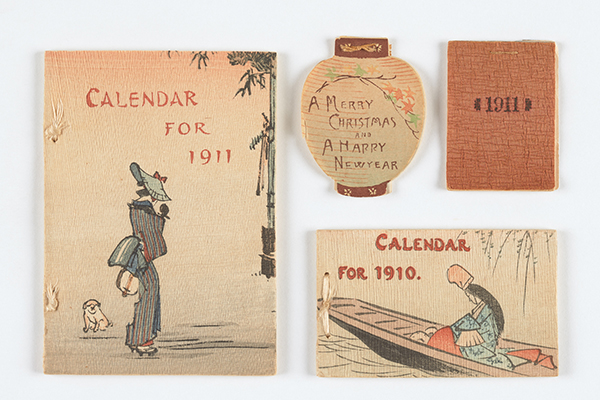 提灯型やノート型で、木彫風の意匠を凝らした愛らしい1910年~1912年の携帯用豆ごよみです。カレンダー(縦長)