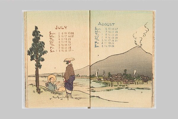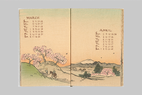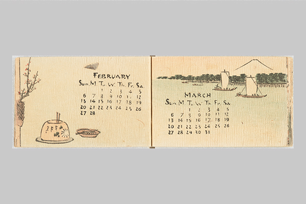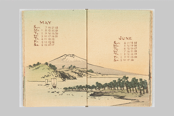 ひと月1ページ、見開き二ケ月分の携帯用こよみ。背景は全ページ季節にあった富士山の淡彩画が彩られています。カレンダー(横長)