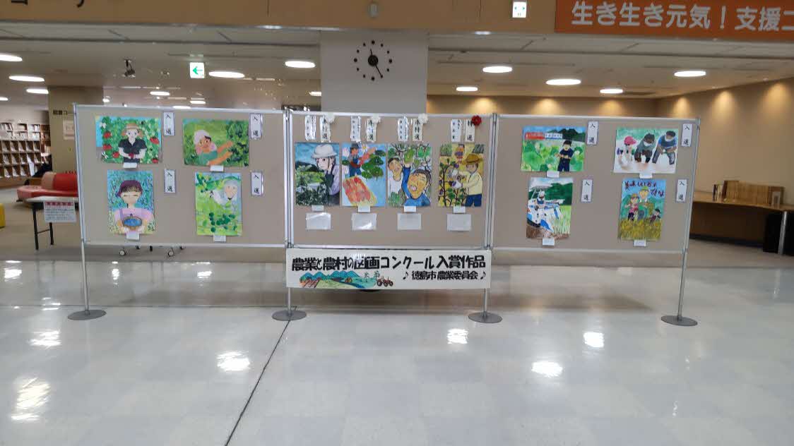 田・畑で働く人をテーマに、徳島市内の小学生が描いた作品を、ふれあい健康館に展示します。ぜひご覧ください。
